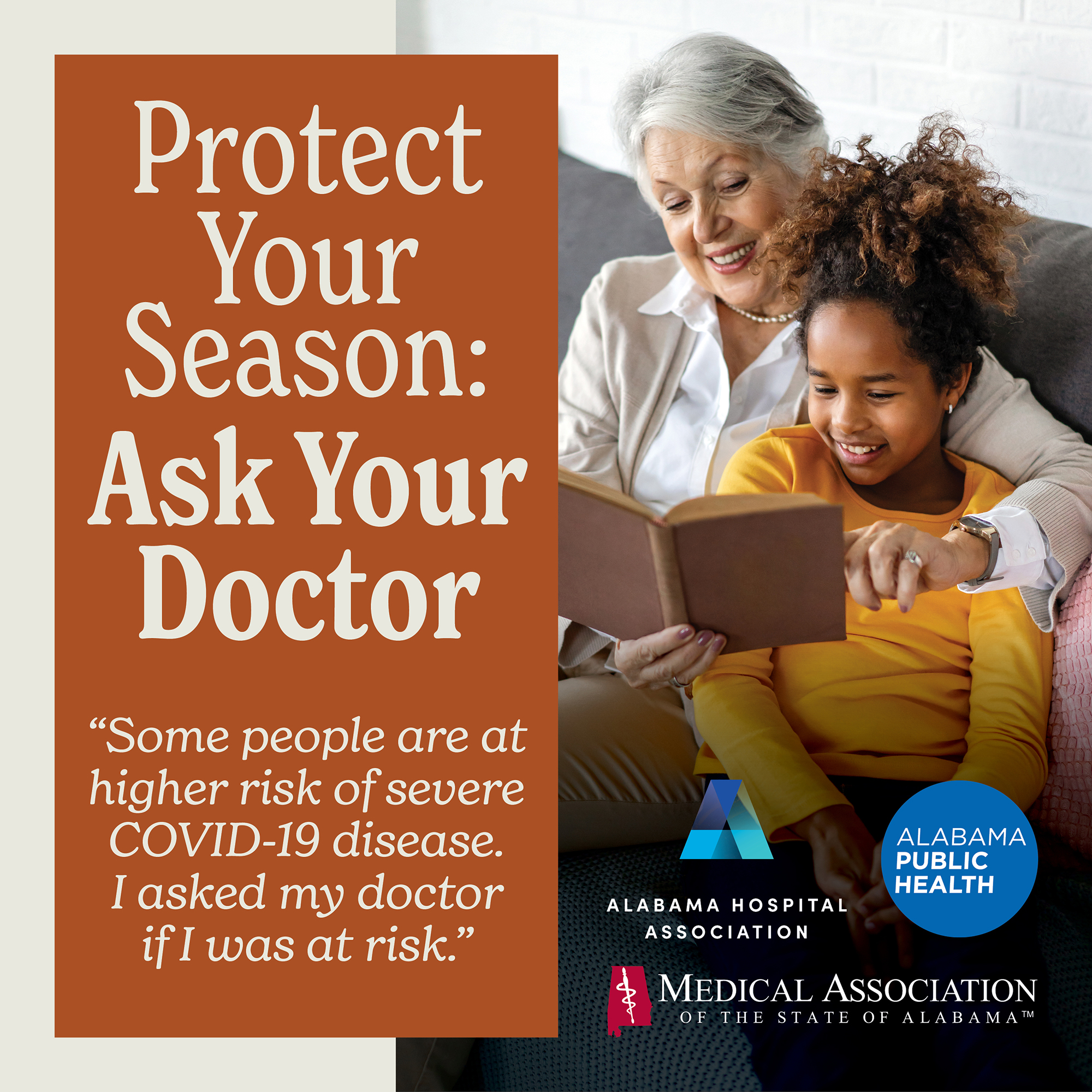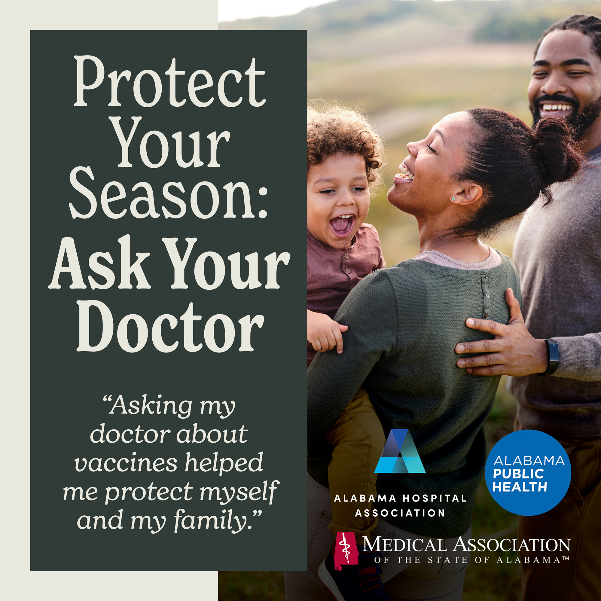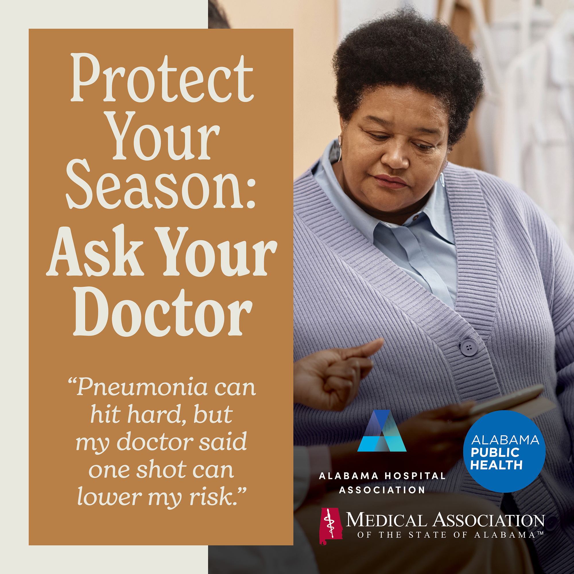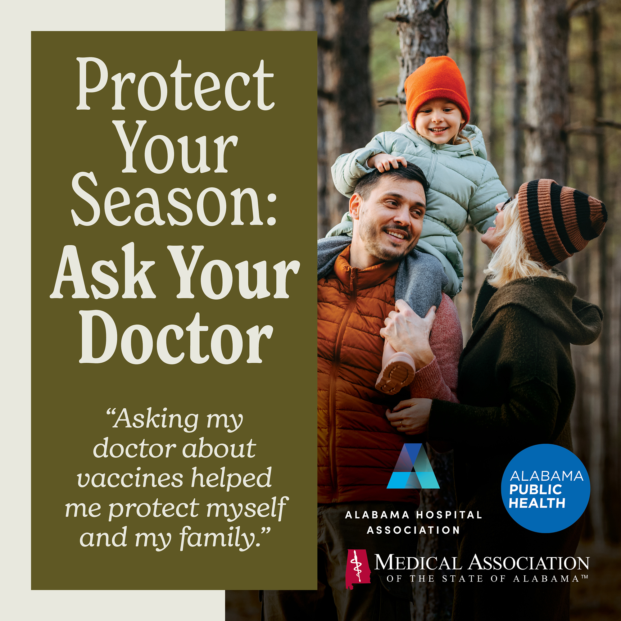 Vaccines protect against flu, RSV, pneumonia, and COVID-19. One conversation can help you stay healthy all winter and enjoy the things you like to do. Ask your doctor which vaccines are right for you. Visit alabamapublichealth.gov/immunization/ask.html for more.