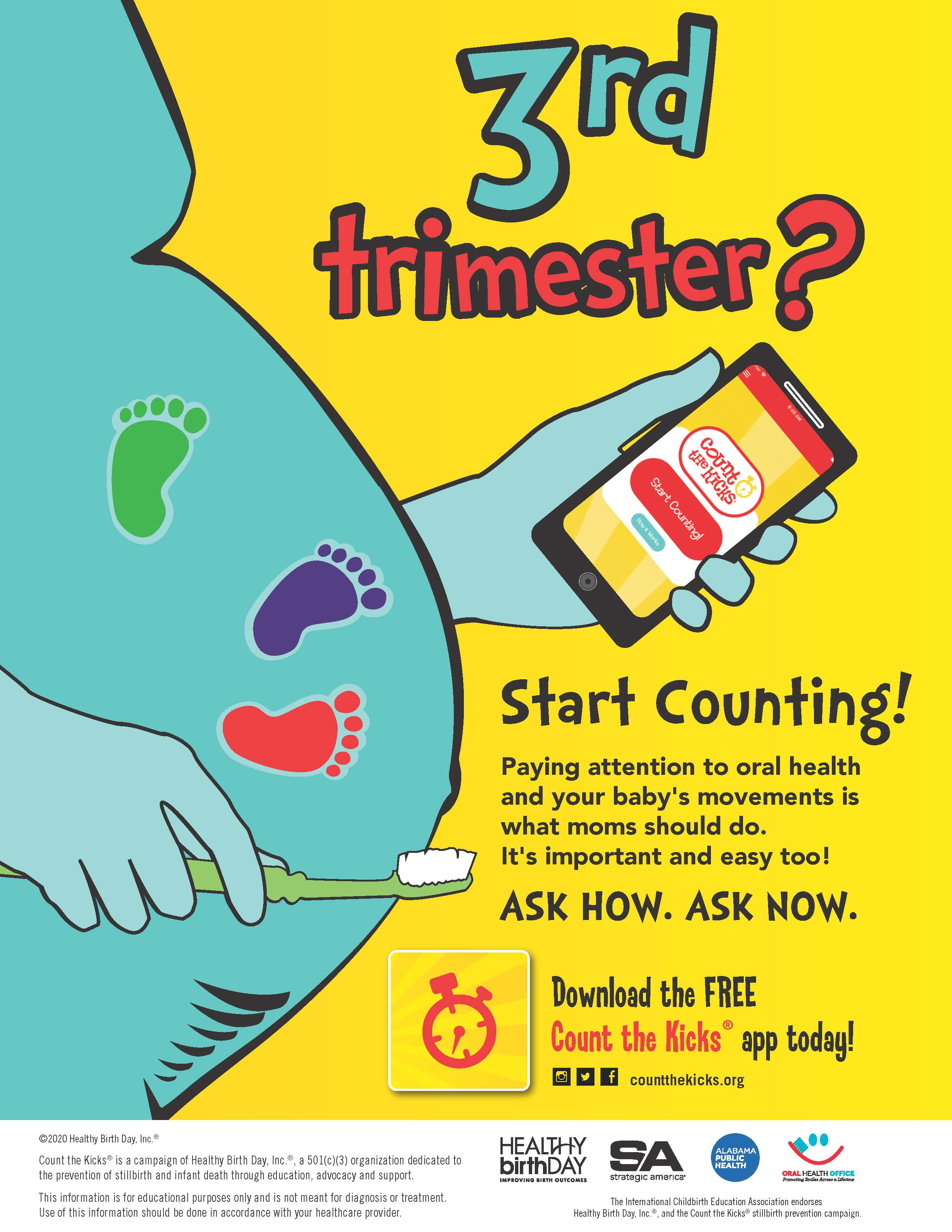 The Board of Dental Examiners of Alabama has approved 2 hours of CE for watching the Count the Kicks training video, reviewing the material in the Resources area on this page, and completion of a short Review Survey. The Oral Health Office of the Alabama Department of Public Health is excited to provide the CEs at no cost to Alabama licensed dentists and hygienists. Dental providers in other states are welcome to watch the training video, but CEs will not be recognized by their governing Board. A score of 75 must be achieved on the Review Survey.
