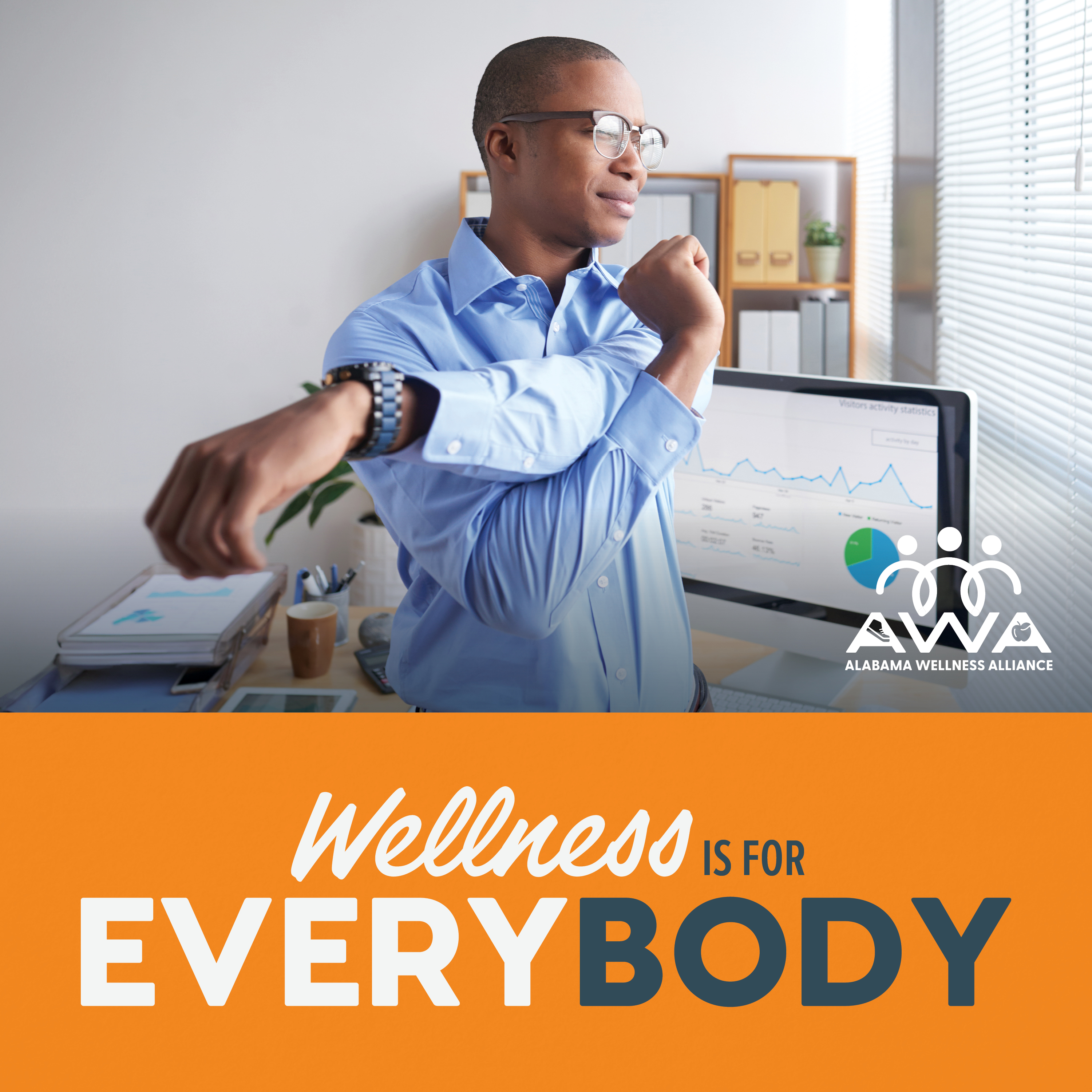 2. Looking for a healthy brain break to recharge at work? Try some physical activity to boost your mood and clear your head. 1. Stand up and stretch every hour to renew your mind and body. 2. Walk around while you take a phone call or have a walking meeting with a co-worker. 3. Do simple desk stretches to engage your muscles and combat fatigue. 4. Take a lunch break walk, which is a great way to enjoy some outdoor air and sunshine and get your steps in. Go to webmd.com/fitness-exercise/video/office-exercises-in-5-minutes for 5-minute exercises that can be done at your desk. #ForEveryBodyAL