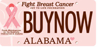 The Joy to Life Foundation has a Fight Breast Cancer car tag that is available now. Proceeds from the car tag will help fund mammograms for the Medically Underserved in Alabama. ABCCEDP will receive more than 80% of the proceeds generated by the "#87" Fight Breast Cancer car tags. The dollars will be used to provide mammograms to women aged 40-64 in Alabama.