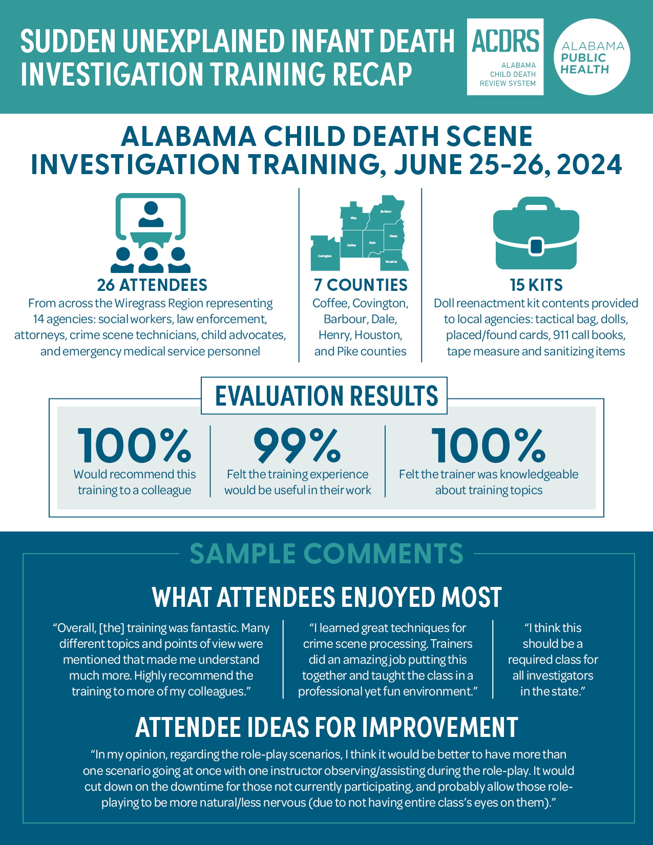 The Alabama Child Death Review System conducted its Alabama Child Death Scene Investigation Training in June of 2024. The training was attended by representatives from sectors including social work, law enforcement, child advocacy, and emergency medical services. For a by-the-numbers recap of the training session, please download the full flyer.