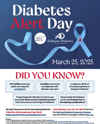 Did you know that, in Alabama, 15.7% of the adult population is living with diabetes? Click on the flyer to learn more about the resources available to you.