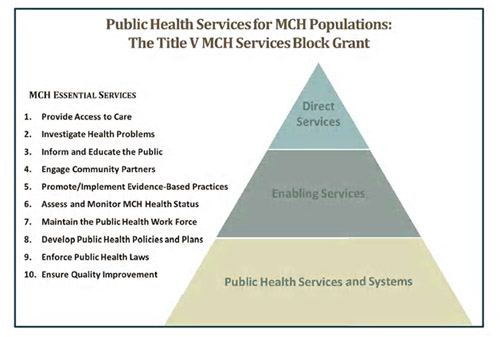 The conceptual framework for the Title V Maternal and Child Health (MCH) Block Grant services is envisioned as a pyramid with three tiers of services and funding levels that provide comprehensive services for mothers and children. The pyramid also displays the uniqueness of the MCH Block Grant, the only federal program that consistently provides services at all levels of the pyramid.