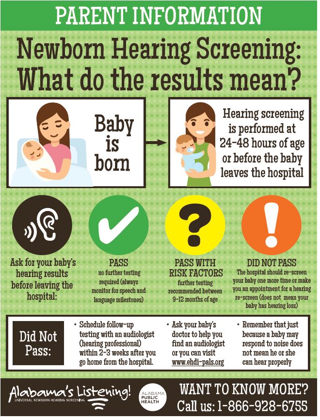 If an infant does not pass the first hearing screen, an attempt may be made to repeat the screen before hospital discharge, or it may be scheduled after going home. If an infant does not pass the second hearing screen, additional hearing tests should be administered under the care of an audiologist or otolaryngologist.