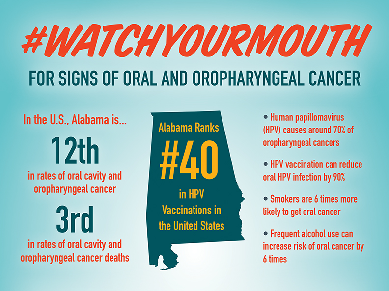 April is Oral Cancer Awareness Month. During this time, the Alabama Department of Public Health would like to remind everyone to #WATCHYOURMOUTH for signs of oral and oropharyngeal cancer.