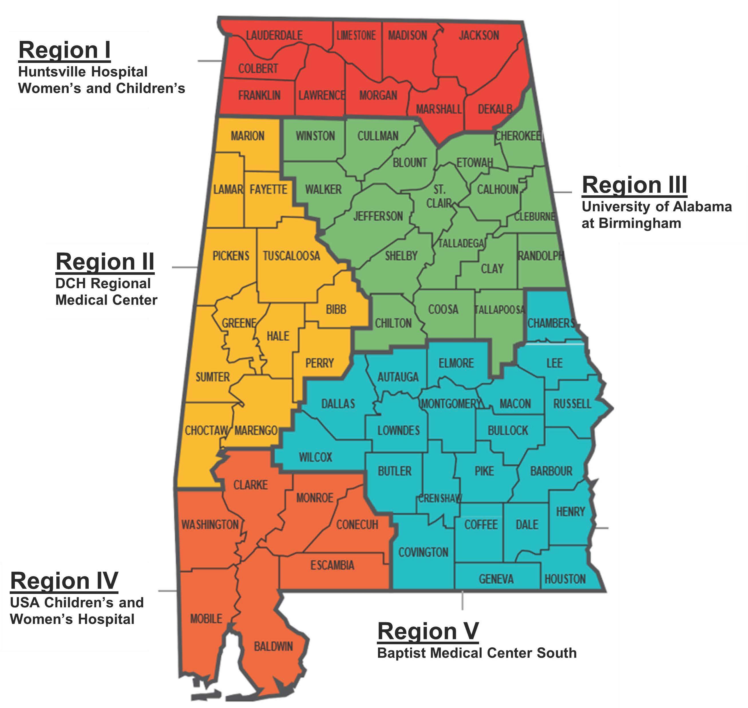 The Alabama Perinatal Program is divided into the following five regions, and Mobile County has its own Fetal and Infant Mortality Review (FIMR) program: