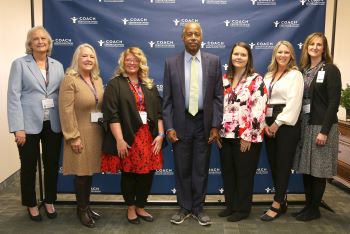 Pictured at the event, left to right, are Nancy Bishop, Vicki Walker, Brittany Stewart, Dr. Ben Carson, Lacey Peacock, Courtnay Cleveland, and Rachel Kiefer. See the Harrison College of Pharmacy's Facebook post for more photos from the Summit.