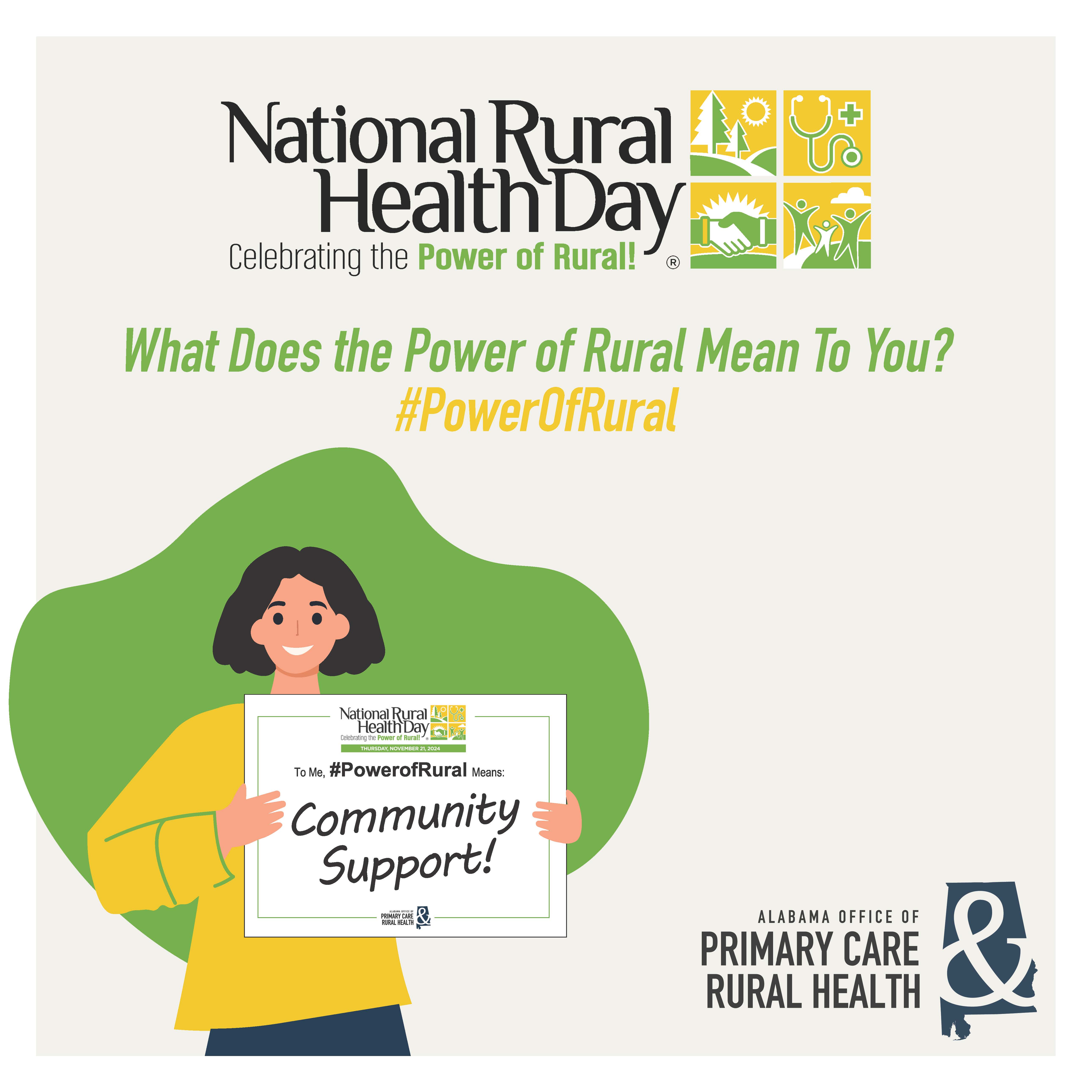 Please visit PowerofRural.org to see how you can celebrate Alabama's rural communities and see our National Rural Health Day page for more information.