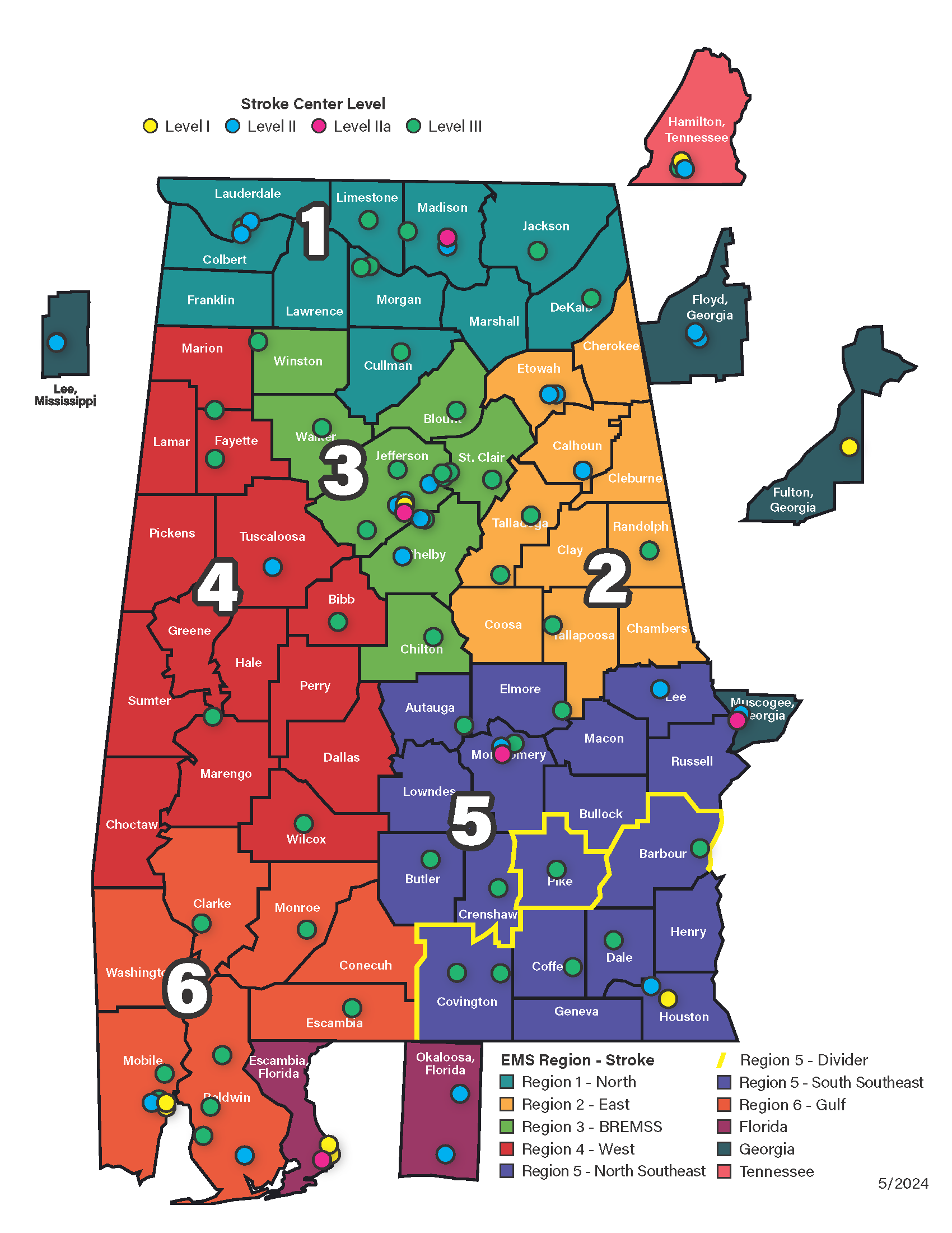 The stroke centers currently active in the Alabama Acute Health System are listed by level.
