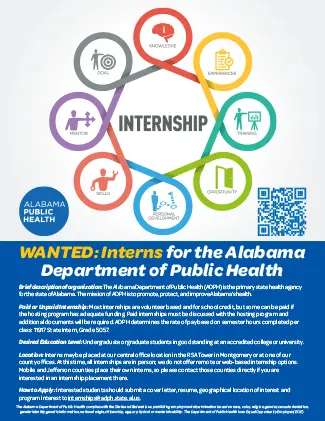 ADPH encourages hosting students enrolled in educational institutions as interns. Limited opportunities are offered throughout the state public health system. Through the internship program, individuals are offered an opportunity to make a positive contribution and develop professional skills and experience. The internship program promotes an opportunity for individuals to: